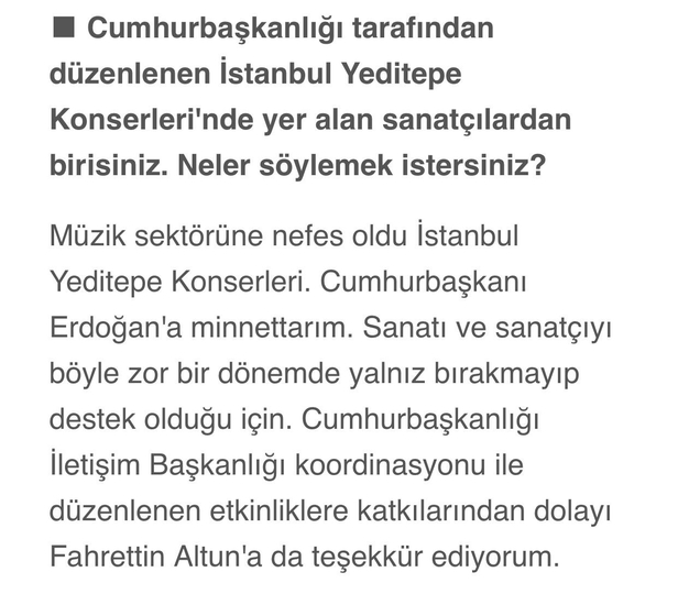 Müzik sektörüne nefes oldu İstanbul Yeditepe Konserleri. Cumhurbaşkanı Erdoğan'a minnettarım. Sanatı ve sanatçıyı böyle zor bir dönemde yalnız bırakmayıp destek olduğu için. Cumhurbaşkanlığı İletişim Başkanlığı koordinasyonu ile düzenlenen etkinliklere katkılarından dolayı Fahrettin Altun'a da teşekkür ediyorum.