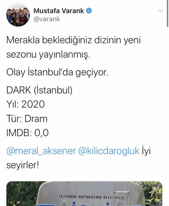Mustafa Varank, 6 Temmuz 2016 tarihinde Şile'de vatandaşların bidonlarla İSKİ tankerinin önünde kuyruğa girdiğine gösteren fotoğrafı paylaşmış ve CHP Genel Başkanı Kemal Kılıçdaroğlu ve İYİ Parti Genel Başkanı Meral Akşener'i etiketleyerek, "Merakla beklediğiniz dizinin yeni sezonu yayınlanmış. Olay İstanbul'da geçiyor. DARK (İstanbul) Yıl: 2020 Tür: Dram IMDB: 0,0 Kemal Kılıçdaroğlu ve Meral Akşener iyi seyirler" ifadelerini kullanmıştı.
