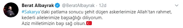 Sakarya'da meydana gelen patlamanın ardından başsağlığı mesajı paylaşan Hazine ve Maliye Bakanı Berat Albayrak, "#Sakarya'daki patlama sonucu şehit düşen askerlerimize Allah'tan rahmet, kederli ailelerimize başsağlığı diliyorum. Aziz milletimizin başı sağ olsun." ifadelerini kullandı.