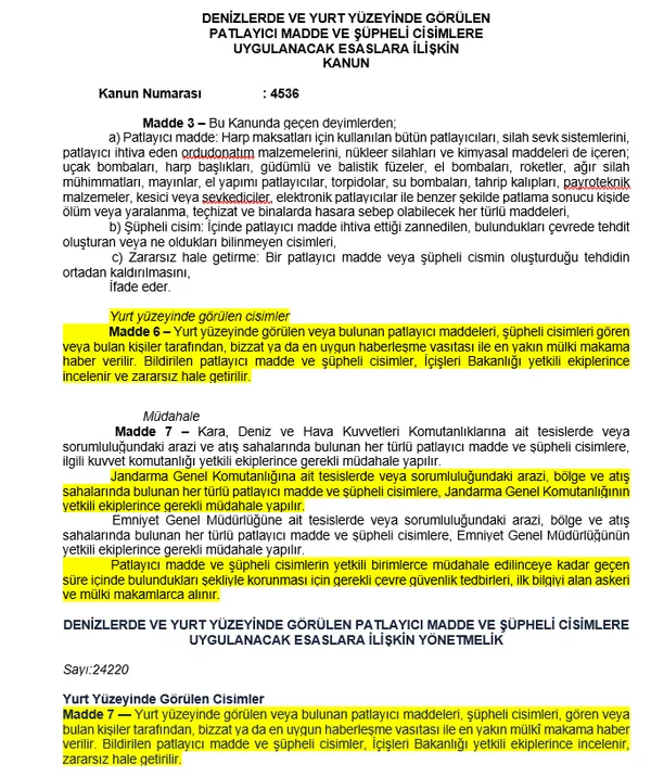 Madde 7 — Yurt yüzeyinde görülen veya bulunan patlayıcı maddeleri, şüpheli cisimleri, gören veya bulan kişiler tarafından, bizzat ya da en uygun haberleşme vasıtası ile en yakın mülkî makama haber verilir. Bildirilen patlayıcı madde ve şüpheli cisimler, İçişleri Bakanlığı yetkili ekiplerince incelenir, zararsız hale getirilir.