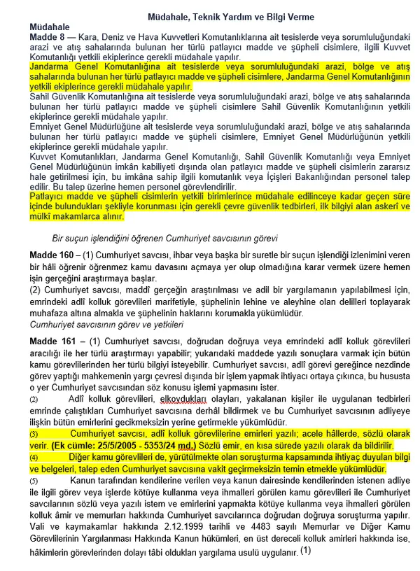 Madde 8 — Kara, Deniz ve Hava Kuvvetleri Komutanlıklarına ait tesislerde veya sorumluluğundaki arazi ve atış sahalarında bulunan her türlü patlayıcı madde ve şüpheli cisimlere, ilgili Kuvvet Komutanlığı yetkili ekiplerince gerekli müdahale yapılır.