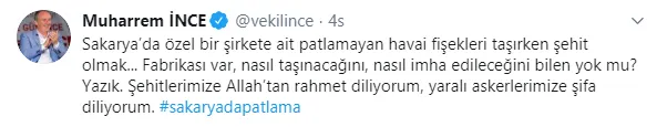 Patlamanın hemen ardından muhalefet hükümeti suçlamaya devam etti. Twitter hesabından durumu manipüle etmeye çalışan CHP'li Muharrem İnce, "Sakarya'da özel bir şirkete ait patlamayan havai fişekleri taşırken şehit olmak... Fabrikası var, nasıl taşınacağını, nasıl imha edileceğini bilen yok mu? Yazık. Şehitlerimize Allah'tan rahmet diliyorum, yaralı askerlerimize şifa diliyorum. #sakaryadapatlama" ifadelerini kullandı.