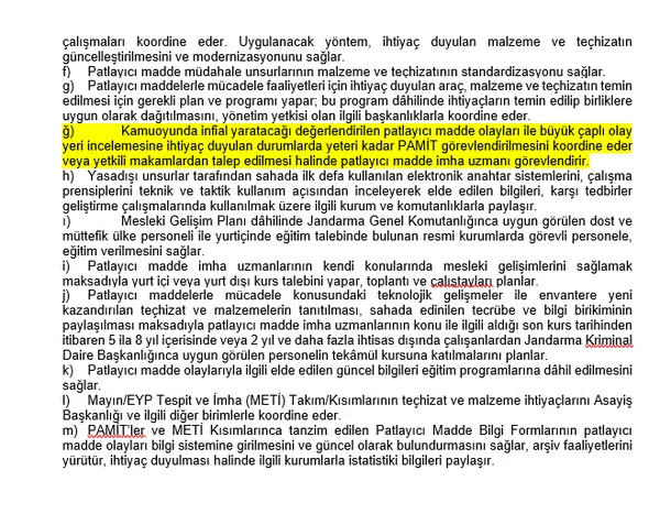 ğ) Kamuoyunda infial yaratacağı değerlendirilen patlayıcı madde olayları ile büyük çaplı olay yeri incelemesine ihtiyaç duyulan durumlarda yeteri kadar PAMİT görevlendirilmesini koordine eder veya yetkili makamlardan talep edilmesi halinde patlayıcı madde imha uzmanı görevlendirir.