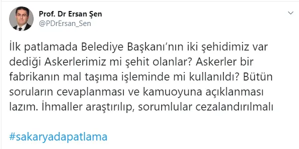 Öte yandan Avukat Ersan Şen ise "İlk patlamada Belediye Başkanı'nın iki şehidimiz var dediği Askerlerimiz mi şehit olanlar? Askerler bir fabrikanın mal taşıma işleminde mi kullanıldı? Bütün soruların cevaplanması ve kamuoyuna açıklanması lazım. İhmaller araştırılıp, sorumlular cezalandırılmalı #sakaryadapatlama" dedi.