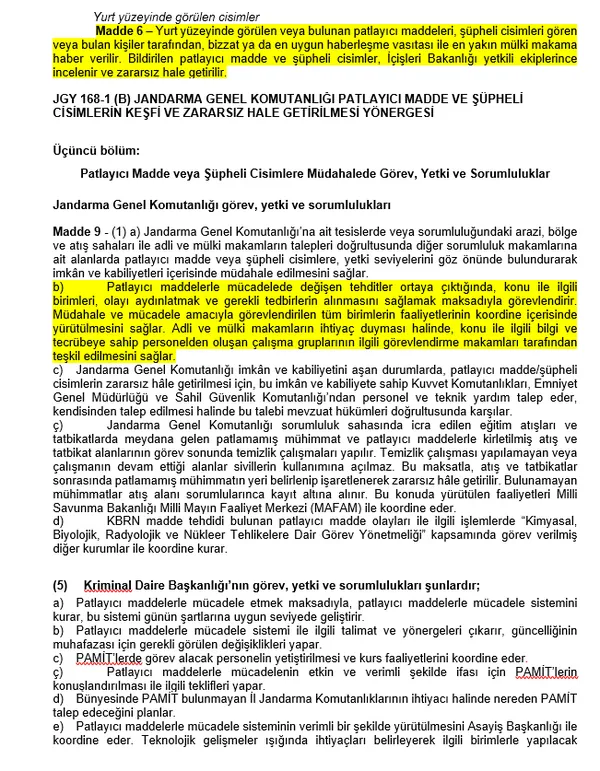 JGY 168-1 (B) JANDARMA GENEL KOMUTANLIĞI PATLAYICI MADDE VE ŞÜPHELİ CİSİMLERİN KEŞFİ VE ZARARSIZ HALE GETİRİLMESİ YÖNERGESİ