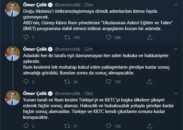 ABD'nin, Güney Kıbrıs Rum yönetimini "Uluslararası Askeri Eğitim ve Talim" (IMET) programına dahil etmesi istikrar arayışlarını bozan bir adımdır.— Ömer Çelik (@omerrcelik) July 9, 2020