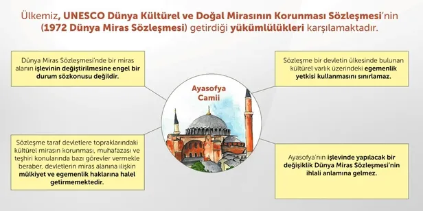 Görselde ayrıca "Sözleşme bir devletin ülkesinde bulunan kültürel varlık üzerinde egemenlik yetkisini kullanmasını sınırlamaz. Ayasofya'nın işlevinde yapılacak bir değişiklik Dünya Mirası Sözleşmesi'nin ihlali anlamına gelmez." ifadesi yer aldı.