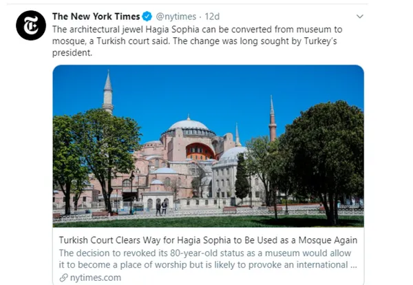 Amerikan New York Times gazetesi de "mimari bir mücevher" olarak tanımladığı Ayasofya'nın mahkeme kararıyla müzeden camiye dönüştürülebileceğini yazdı. Öte yandan değişimin uzun süredir Cumhurbaşkanı Tayyip Erdoğan tarafından istendiğine vurgu yaptı.