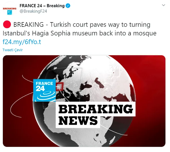 France 24 ,'harikalar harikası' olarak tanımladığı Ayasofya'nın camiye dönüştürülmesinin önü açıldı dedi.