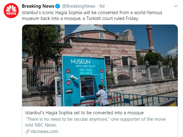 NBC News'te İstanbul'un dünyaca ünlü ikonik Ayasofya'sı camiye dönüşüyor ifadelerine yer verildi.