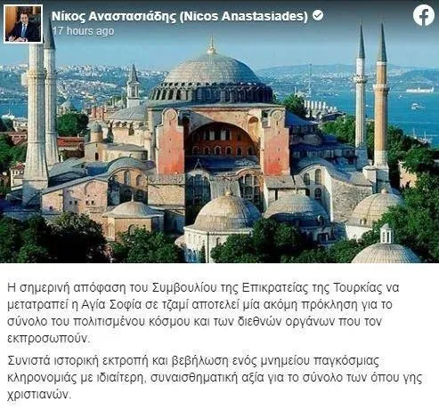 Ayasofya'nın yeniden camiye dönüştürülmesinden rahatsız olanlar arasında Güney Kıbrıs Rum Kesimi de var. Rum Kesimi lideri Nikos Anastasiadis, sosyal medya hesabından yaptığı paylaşımda, Ayasofya'nın fotoğrafına yer verdi.