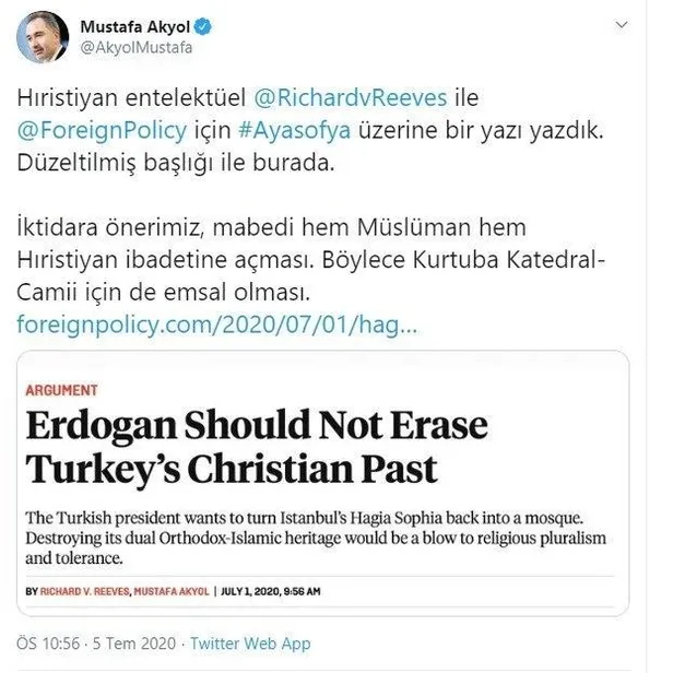 Akyol, Türkiye aleyhine propaganda yaptığı makaleyi şu sözlerle Twitter üzerinden pazarladı: "Hıristiyan entelektüel Richardv Reeves ile Foreign Policy için Ayasofya üzerine bir yazı yazdık. Düzeltilmiş başlığı ile burada. İktidara önerimiz, mabedi hem Müslüman hem Hıristiyan ibadetine açması. Böylece Kurtuba Katedral-Camii için de emsal olması."