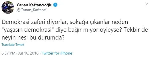 Kaftancıoğlu o paylaşımında "Demokrasi zaferi diyorlar, sokağa çıkanlar neden "yaşasın demokrasi" diye bağır mıyor öyleyse? Tekbir de neyin nesi bu durumda?" ifadelerini kullandı.