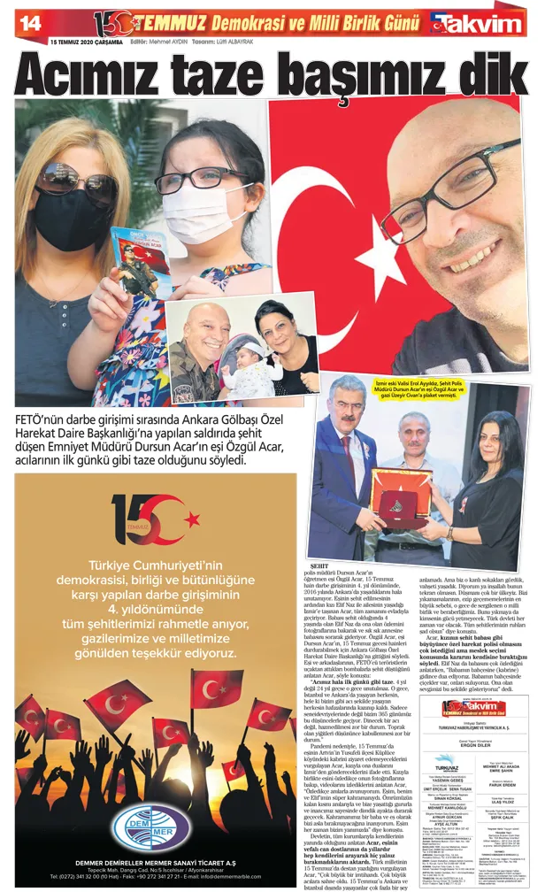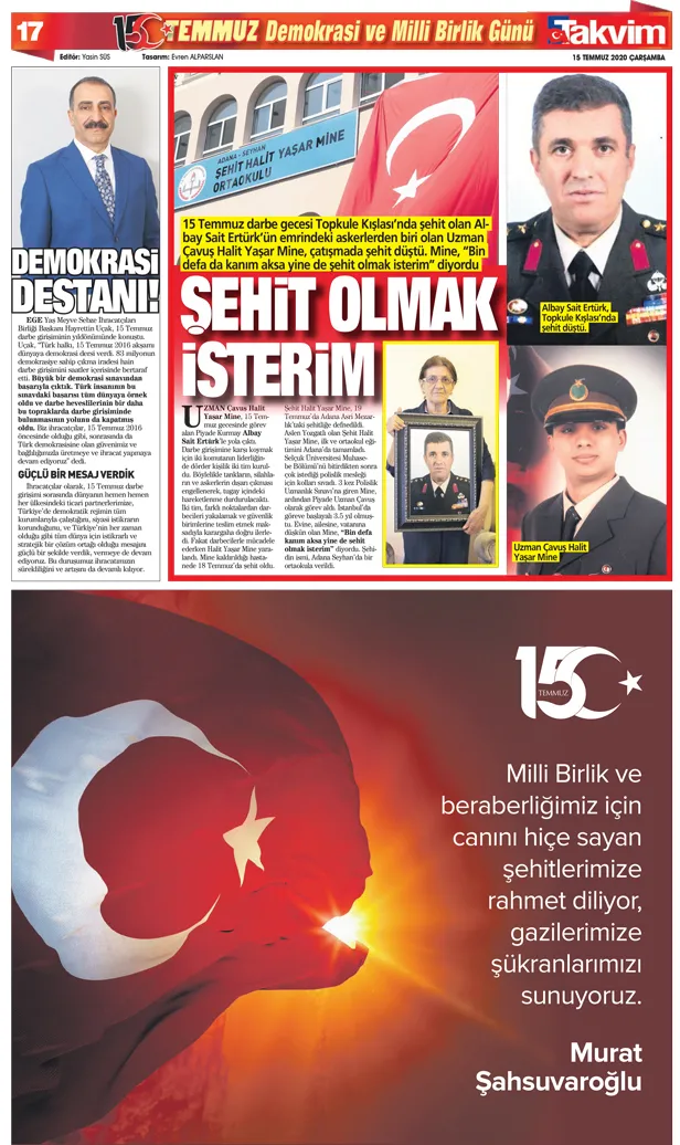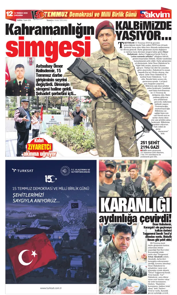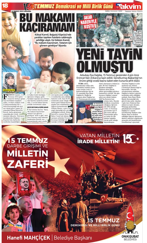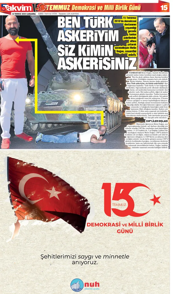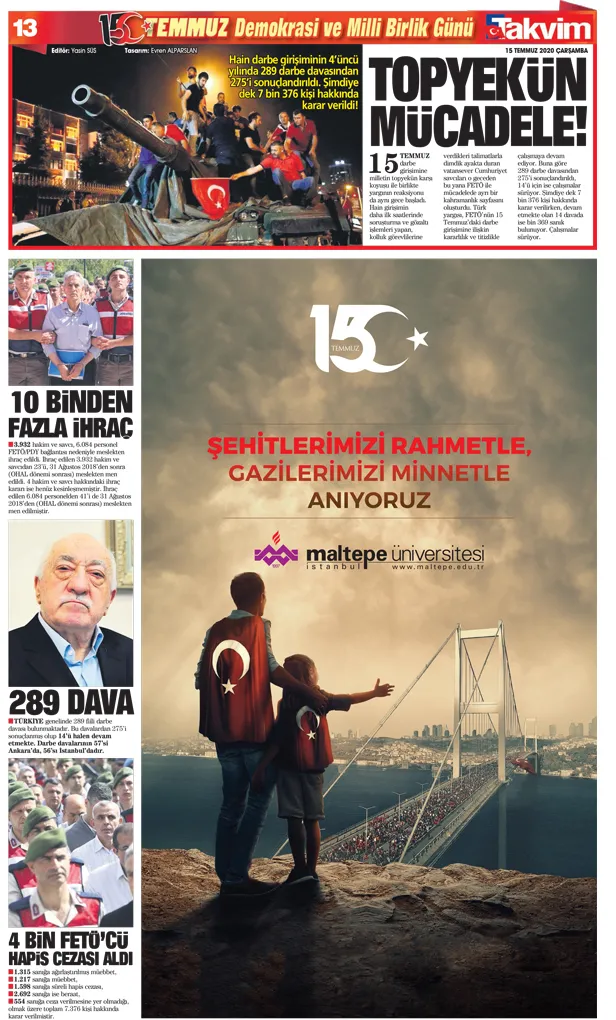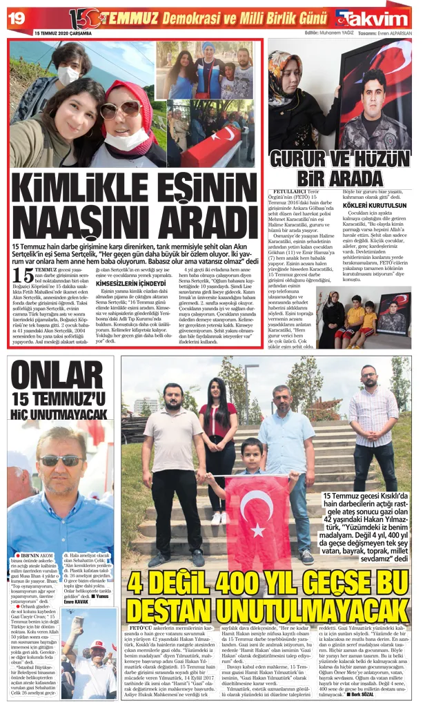 FETÖ'nün 15 Temmuz 2016'da kalkıştığı hain darbe girişimine karşı milletin yazdığı destanın 4. yıl dönümünde Takvim Gazetesi 15 Temmuz'a özel ek hazırladı. İşte Takvim Gazetesi'nin 15 Temmuz özel ekinde yer alan o haberler..