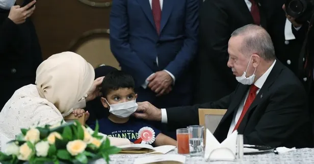 Emine Erdoğan, paylaşımında Cumhurbaşkanlığı Külliyesi'nde düzenlenen 15 Temmuz Şehitleri Anma Programı'nda bir şehit çocuğunun da bulunduğu fotoğrafa yer verdi.