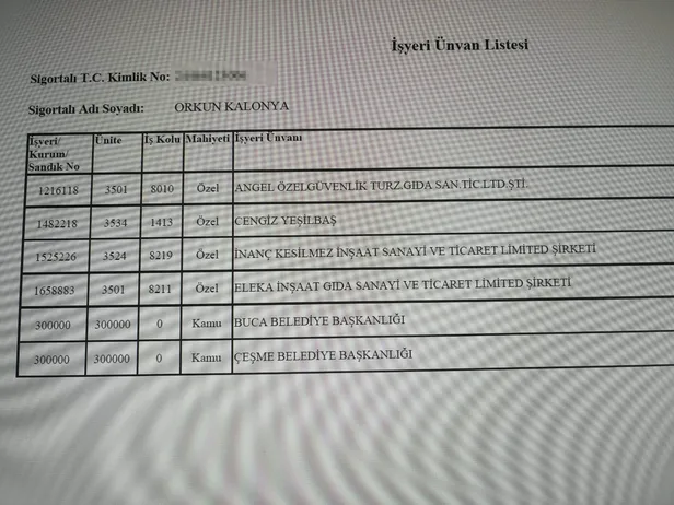 Tuncay Özkan'ın şoförlüğünden Çeşme Belediye Başkan Yardımcılığına yükselen Orkun Kalonyo, kısa bir süre önceye kadar İzmir merkezli Eleka İnşaat adlı bir firmada sigortalı olarak çalışıyordu. Kalonya boş zamanlarında ise sanatsal içerikli moda çekimlerinde konu mankenliği yapıyordu. Kalonya'nın eski şirketi Eleka'nın, Talatpaşa Bulvarı 33/13 adresindeki ofisi Tuncay Özkan tarafından özel büro olarak da kullanılıyordu. Resmi evrakta Ayten Öztürk adına kayıtlı Eleka İnşaat, 26.09.2018 tarihinde Helsinki'de yaşayan Cengiz Özyeşil'e devredildi. Şirket bu devir işleminden kısa bir süre sonra adresini Marmaris-İçmeler'e taşıdı.