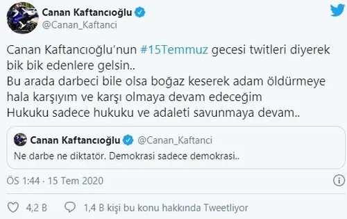 CHP İstanbul İl Başkanı 15 Temmuz gecesi attığı tweetleri hala silmediği için eleştirenlere cevap niteliğinde bir paylaşım yaptı. Hukuku sadece hukuku ve adaleti savunmaya devam edeceğini belirten Kaftancıoğlu, "Canan Kaftancıoğlu'nun 15 Temmuz gecesi twitleri diyerek bik bik edenlere gelsin.. Bu arada darbeci bile olsa boğaz keserek adam öldürmeye hala karşıyım ve karşı olmaya devam edeceğim" dedi.