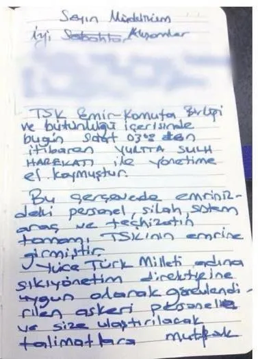 İstanbul 14. Ağır Ceza Mahkemesi'nde görülen darbe davasının dosyasında da yer alan Uzay Şahin'in kendi el yazısı ile yazdığı o talimat, darbenin gece planladığını ancak daha erken saate çekildiğini gösteriyor.