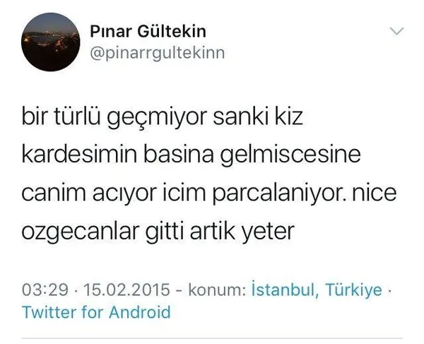 Son dakika haberi... Türkiye'yi ayağa kaldıran Pınar Gültekin cinayetinde çarpıcı detaylar ortaya çıkmaya devam ediyor. Muğla’da Cemal Metin Avcı tarafından vahşice katledilen Pınar Gültekin’in 2015 yılında yine kendisi gibi vahşi bir cinayete kurban giden Özgecan Aslan ile ilgili tweetler attığı ortaya çıktı. Sabah Gazetesi'nden Hayrettin Şaşmaz'ın haberine göre Gültekin’in ‘Bir türlü geçmiyor, sanki kız kardeşimin başına gelmişçesine canım acıyor, içim parçalanıyor. Nice Özgecanlar gitti, artık yeter’ diyerek acısını paylaştığı belirlendi.