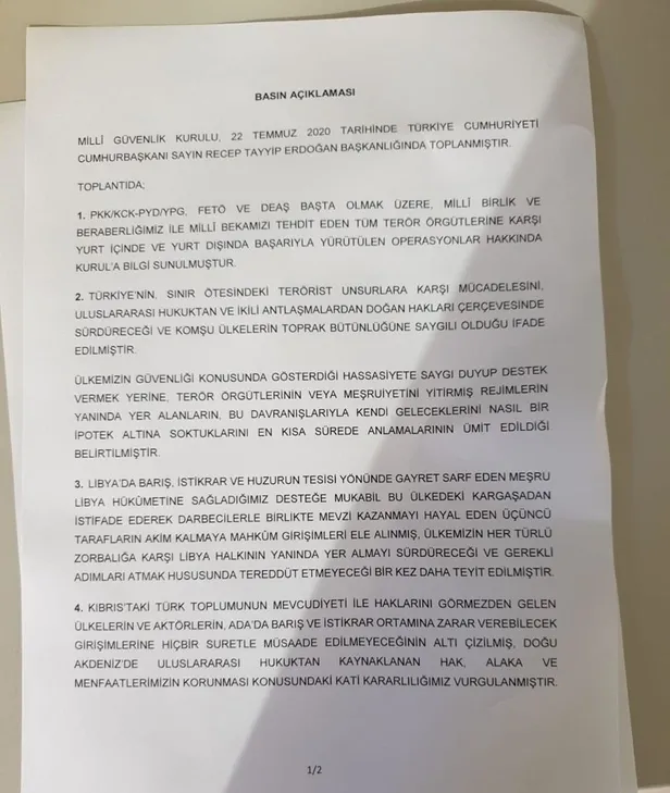 MGK Bildirisi yayımlandı. Bildiride, Türkiye'nin meşru Libya hükümetinin yanında yer almayı sürdüreceği vurgulandı.