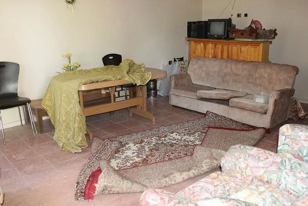 Evin salon bölümünde halıların dağınık olduğu görüntülendi.
