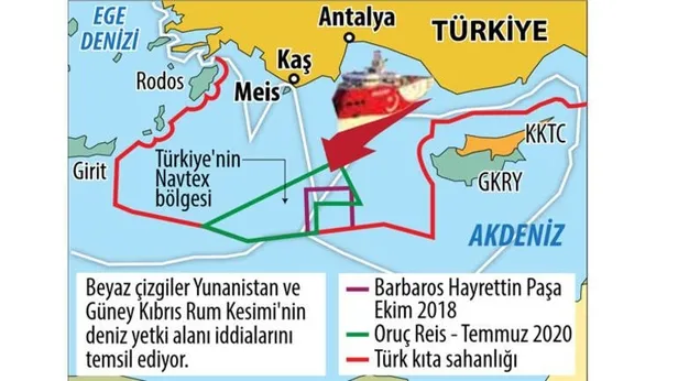 * Türkiye'nin Oruç Reis'in yapacağı çalışmalar için Navtex ilan etmesinin ardından Türk Deniz Kuvvetleri'ne bağlı iki fırkateyn, araştırma gemisine eşlik etmeye başladı. Oruç Reis, şu anda Antalya Körfezi açıklarında demirli.