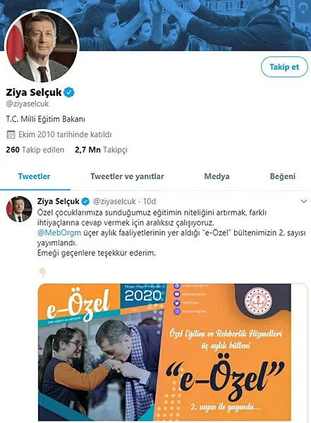 Bakan Selçuk, Twitter hesabından Özel Eğitim ve Rehberlik Hizmetleri Genel Müdürlüğü'nün hazırladığı 'e-Özel' bülteniyle ilgili paylaşımda bulundu. Selçuk, "Özel çocuklarımıza sunduğumuz eğitimin niteliğini artırmak, farklı ihtiyaçlarına cevap vermek için aralıksız çalışıyoruz. Genel Müdürlüğün üçer aylık faaliyetlerinin yer aldığı 'e-Özel' bültenimizin 2'nci sayısı yayımlandı. Emeği geçenlere teşekkür ederim" ifadelerine yer verdi.