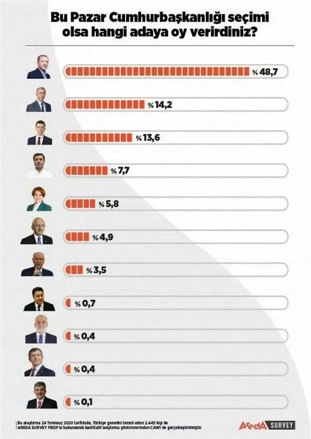 Türkiye 2023 hedeflerine doğru ilerlerken, araştırma şirketi AREDA Survey'in yaptığı seçim anketi vatandaşların Başkan Recep Tayyip Erdoğan'a duyduğu güveni bir kez daha ortaya koydu. Ayasofya camiinin 86 yıl sonra ibadete açıldığı dün (24 Temmuz) yapılan ve 2 bin 445 kişinin katıldığı ankette katılımcılara "Bu pazar Cumhurbaşkanlığı seçimi olsa hangi adaya oy verirdiniz?" sorusu yöneltildi. Katılımcıların yüzde 48,7'si Başkan Recep Tayyip Erdoğan'ı tercih etti.