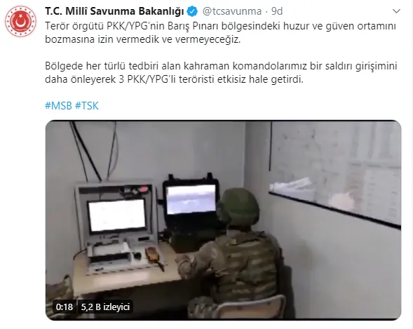 MSB'den yapılan son dakika açıklamasında "Terör örgütü PKK/YPG’nin Barış Pınarı bölgesindeki huzur ve güven ortamını bozmasına izin vermedik ve vermeyeceğiz. Bölgede her türlü tedbiri alan kahraman komandolarımız bir saldırı girişimini daha önleyerek 3 PKK/YPG’li teröristi etkisiz hale getirildi." ifadeleri kullanıldı.