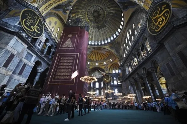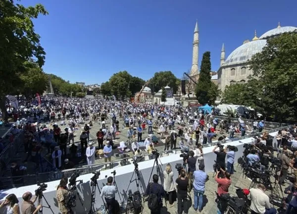 Yunan televizyon kanalları, Ayasofya Meydanı'ndan yaptıkları canlı bağlantılarda, "Hristiyanlar için kara gün", "Erdoğan dediğini yaptı" şeklinde yorumlarda bulundu. Televizyon kanalları, Cumhurbaşkanı Recep Tayyip Erdoğan'ın cami içerisinde namaz öncesinde Kur'an-ı Kerim okumasını da ekranlarına canlı olarak aktardı.