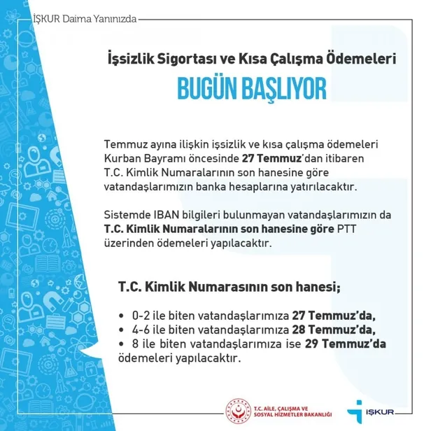 Aile, Çalışma ve Sosyal Hizmetler Bakanı Zehra Zümrüt Selçuk, Temmuz ayına ilişkin işsizlik ve kısa çalışma ödemelerinin bugünden itibaren hesaplara yatırılacağını duyurdu. IBAN bilgileri bulunmayan vatandaşlara da PTT üzerinden ödemelerin yapılacağını hatırlatan Bakan Selçuk, "T.C. Kimlik Numaralarının son hanesi; 0-2 olanlara 27 Temmuz'da, 4-6 olanlara 28 Temmuz'da, 8 olanlara 29 Temmuz'da ödemeler yapılacak." açıklamasını yaptı. Günlük kısa çalışma ödeneği; sigortalının son oniki aylık prime esas kazançları dikkate alınarak hesaplanan günlük ortalama brüt kazancının % 60'ıdır. Bu şekilde hesaplanan kısa çalışma ödeneği miktarı, aylık asgari ücretin brüt tutarının % 150'sini geçemez.