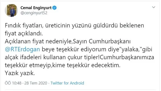Aynı zamanda Cemal Enginyurt, Başkan Erdoğan'a teşekkür ettiği için kendisine yapılan saldırılara karşı, "Fındık fiyatları, üreticinin yüzünü güldürdü beklenen fiyat açıklandı. Açıklanan fiyat nedeniyle,Sayın Cumhurbaşkanı Recep Tayyip Erdoğan beye teşekkür ediyorum diye 'yalaka' gibi alçak ifadeleri kullanan çukur tipler! Cumhurbaşkanımıza teşekkür etmeyip kime teşekkür edecektim? Yazık yazık." mesajını paylaştı.