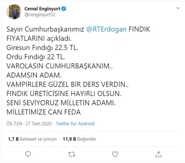 Enginyurt, "Sayın Cumhurbaşkanımız Recep Tayyip Erdoğan fındık fiyatlarını açıkladı. Giresun fındığı 22.5 TL. Ordu Fındığı 22 TL. Varolasın cumhurbaşkanım.. Adamsın adam. Vampirlere güzel bir ders verdin.. Fındık üreticisine hayırlı olsun. Seni seviyoruz milletin adamı. Milletimize can feda" ifadelerini kullandı.
