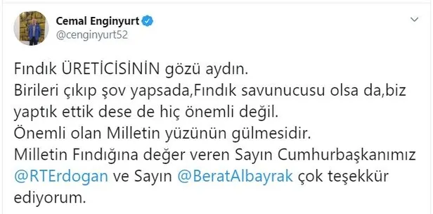 Enginyurt, "Fındık üreticisinin gözü aydın. Birileri çıkıp şov yapsada, Fındık savunucusu olsa da,biz yaptık ettik dese de hiç önemli değil. Önemli olan Milletin yüzünün gülmesidir. Milletin Fındığına değer veren Sayın Cumhurbaşkanımız Recep Tayyip Erdoğan ve Sayın Berat Albayrak'a çok teşekkür ediyorum." diye yazdı.