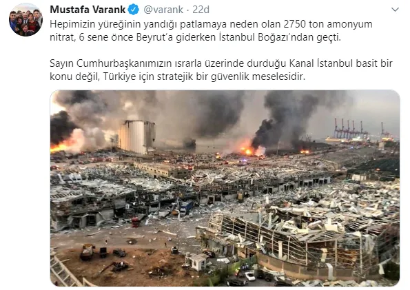 Sanayi ve Teknoloji Bakanı Varank, sosyal paylaşım sitesi Twitter'daki hesabından yaptığı açıklamada, "Hepimizin yüreğinin yandığı patlamaya neden olan 2750 ton amonyum nitrat, 6 sene önce Beyrut'a giderken İstanbul Boğazı'ndan geçti. Sayın Cumhurbaşkanımızın ısrarla üzerinde durduğu Kanal İstanbul basit bir konu değil, Türkiye için stratejik bir güvenlik meselesidir" dedi.