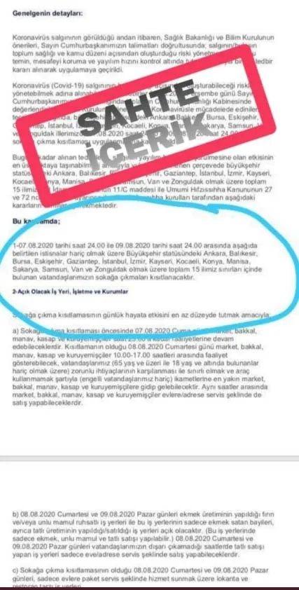 Covid-19 salgınıyla ilgili alınan tüm tedbirler bu güne kadar resmi kanallarla duyurulmuştur. Bundan sonraki süreçte de olası alınacak tedbirler yine resmi kanallar vasıtasıyla duyurulacaktır Bu tür kaynağı belli olmayan sahte belgelere itibar edilmemesi rica olunur.