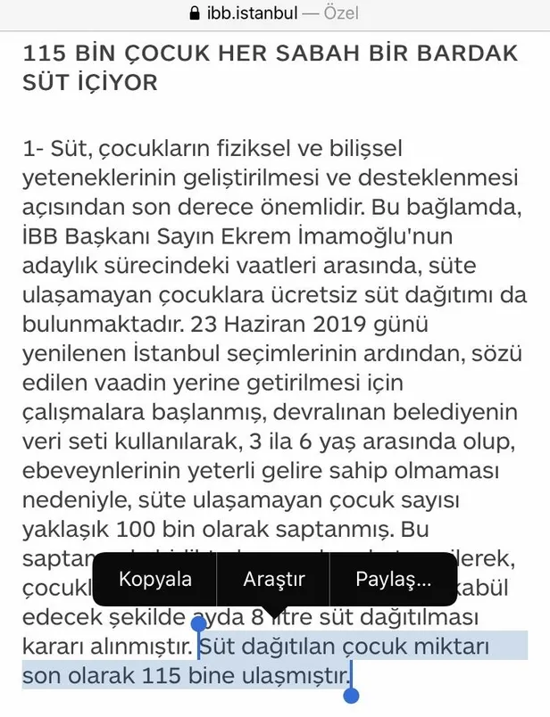 İBB açıklamasında; "Süt dağıtılan çocuk miktarı son olarak 115 bine ulaşmıştır" denildi.