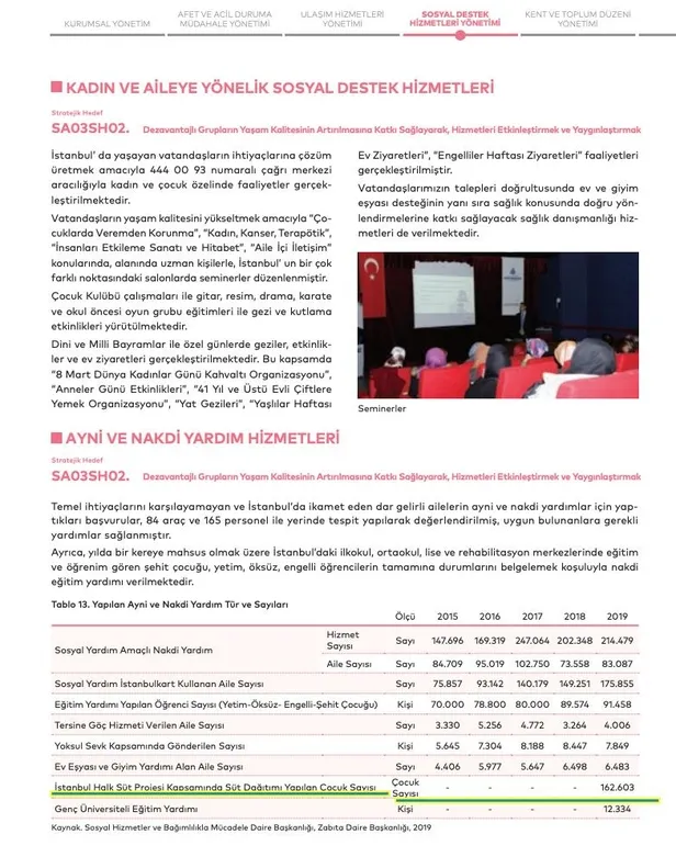 Raporun 150. Sayfasında ise; "İstanbul Halk Süt Projesi Kapsamında Süt Dağıtımı Yapılan Çocuk Sayısı 162 bin 602" ifadeleri yer aldı.