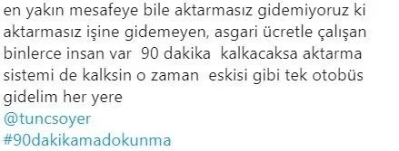 En yakın mesafeye bile aktarmasız gidemiyoruz ki... Aktarmasız işine gidemeyen, asgari ücretle çalışan binlerce insan var. 90 dakika kalkacaksa aktarma sistemi de kalksın o zaman, eskisi gibi tek otobüs gidelim her yere...