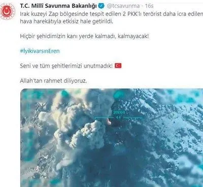 Milli Savunma Bakanlığı, Irak'ın kuzeyindeki Zap bölgesinde tespit edilen PKK'lı 2 teröristin daha hava harekatıyla etkisiz hale getirildiğini bildirdi. Bakanlığın Twitter hesabından yapılan açıklamada, "Hiçbir şehidimizin kanı yerde kalmadı, kalmayacak. İyi ki varsın Eren. Seni ve tüm şehitlerimizi unutmadık" denildi.