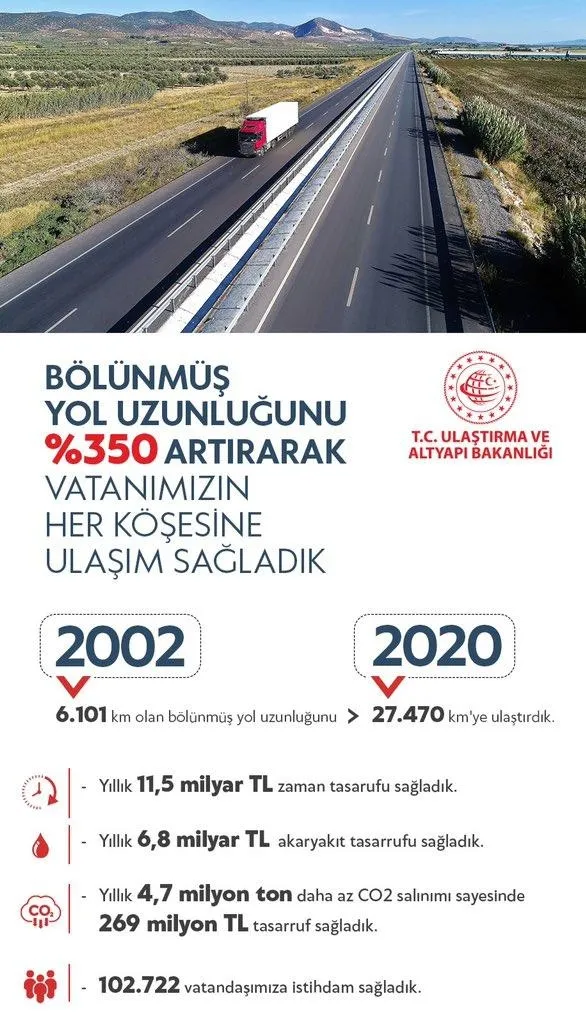🛣️Bölünmüş yol uzunluğunu 2002'den bu yana %350 artırarak 27.470 km'ye çıkardık.