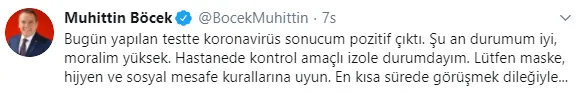 Böcek, sosyal medya hesabı Twitter'dan yaptığı paylaşımla, dün yapılan Kovid-19 testinin sonucunun pozitif çıktığını duyurdu.