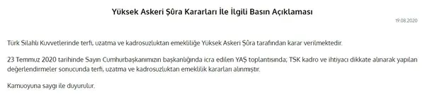 MSB'den yapılan yazılı açıklamada, "Türk Silahlı Kuvvetlerinde terfi, uzatma ve kadrosuzluktan emekliliğe Yüksek Askeri Şura tarafından karar verilmektedir. 23 Temmuz 2020 tarihinde Sayın Cumhurbaşkanımızın başkanlığında icra edilen YAŞ toplantısında, TSK kadro ve ihtiyacı dikkate alınarak yapılan değerlendirmeler sonucunda terfi, uzatma ve kadrosuzluktan emeklilik kararları alınmıştır" ifadelerine yer verdi.