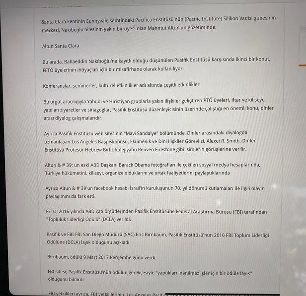 FBI, Pasifik Enstitüsüne 2016'da "Toplum Liderliği Ödülü" (DCLA) vermişti. FETÖ'nün FBI İmamı olan Bilal Ekşili'nin yanı sıra Cemil Teber, Faruk Taban, Süleyman Turhanoğulları ve Özkur Yıldız gibi FETÖ'cü isimlerle fotoğrafı bulunan Altun'un, FETÖ'nün "para kasası" olarak bilinen Osman Nakıboğlu ve oğlu Bahaeddin Nakıboğlu'yla da bağlantısı var.