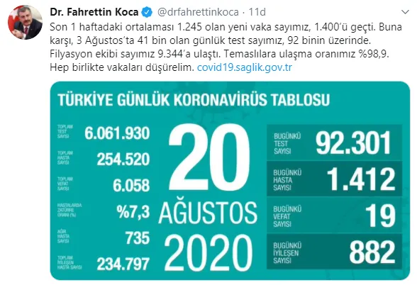 Sağlık Bakanı Fahrettin Koca 20 Ağustos koronavirüs vaka sayılarını açıkladı. Türkiye'de son 24 saatte 1412 kişiye Kovid-19 tanısı konuldu, 19 kişi hayatını kaybetti, toplam vaka sayısı 254 bin 520 bin, can kaybı 6 bin 58 oldu. Koca, Twitter hesabından yaptığı açıklamada, "Son 1 haftadaki ortalaması 1.245 olan yeni vaka sayımız, 1.400'ü geçti. Buna karşı, 3 Ağustos'ta 41 bin olan günlük test sayımız, 92 binin üzerinde. Filyasyon ekibi sayımız 9.344'a ulaştı. Temaslılara ulaşma oranımız %98,9. Hep birlikte vakaları düşürelim" dedi.