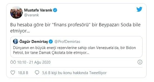 Varank, Demirtaş'ın twitini RT yaparak ''Bu hesaba göre bir "finans profesörü" bir Beypazarı Soda bile etmiyor...'' dedi.
