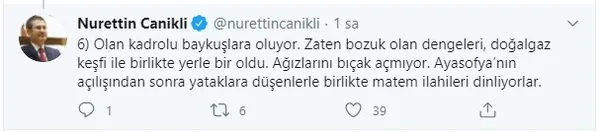 Olan kadrolu baykuşlara oluyor. Zaten bozuk olan dengeleri, doğalgaz keşfi ile birlikte yerle bir oldu. Ağızlarını bıçak açmıyor. Ayasofya'nın açılışından sonra yataklara düşenlerle birlikte matem ilahileri dinliyorlar.