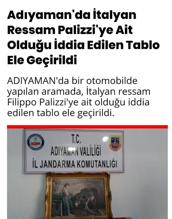 2017 yılında Adıyaman'ın Kahta ilçesinde jandarma ekiplerince düzenlenen operasyonda da bir otomobilde 3 kişi ile birlikte İtalyan ressam Filippo Palizzi imzası taşıyan bir tablo ele geçirilmiş.