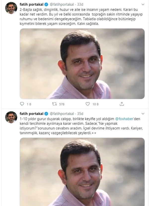 FOX TV'nin açıklamalarının hemen ardından Twitter hesabından paylaşım yapan Fatih Portakal, "10 yıldır gurur duyarak calışıp, birlikte keyifle yol aldığim@foxhaber 'den kendi tercihimle ayrılmaya karar verdim. Sadece,"Ne yapmak istiyorum?"sorusunun cevabını aradım. İçsel devrime ihtiyacım vardı. Kariyer, tanınmışlık, kazanç vazgeçilebilecek şeylerdi. Başta sağlık, dinginlik, huzur ve aile ise insanın yaşam nedeni. Karari bu kadar net verdim. Bu yıl ve belki sonrasında toprağin sakin ritminde yaşayıp ruhumu ve bedenimi dengeleyeceğim. Tabiatla olabildiğince bütünleşip kıymetini bilerek yaşam süreceğim. Kalın sağlıkla." dedi.