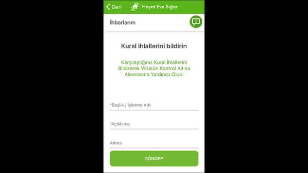 Bunun için uygulamanın ana ekranında yer alan ihbarda bulun sekmesini kullanmak yeterli. Burada başlık / işletme adı, açıklama, adres gibi gerekli yerleri doldurarak, ihtiyaç halinde fotoğraf da ekleyerek dikkatsiz davranan, kurallara uymayan kişileri veya kurumlar ihbar edilebilirsiniz.